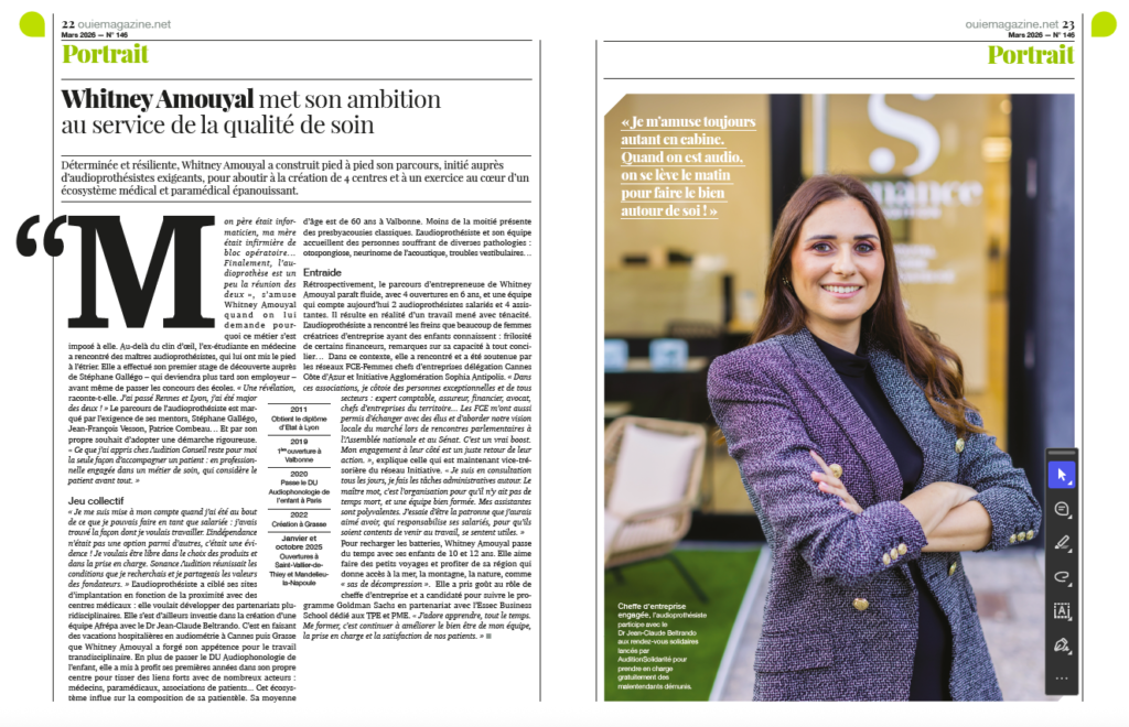 Dans ce contexte, la présence de Whitney Amouyal dans la revue professionnelle L’Ouïe Magazine constitue une véritable reconnaissance de son engagement dans le domaine de l’audioprothèse et de la prévention auditive.
